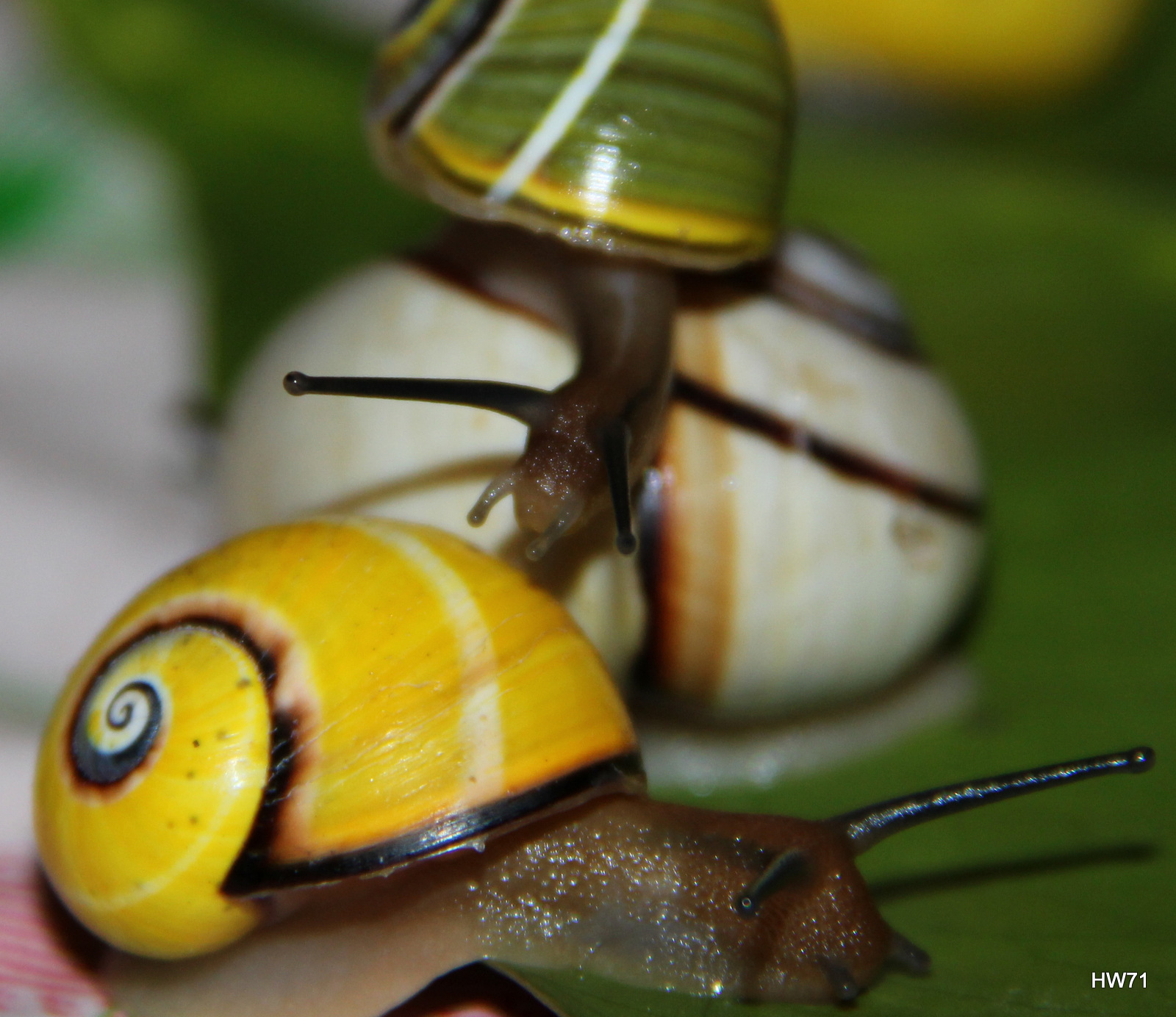 2013-Apr-24 Baracoa, Guantánamo, Cuba: Polymita Picta, also known as the Cuban Land Snail or Painted Snail, are endemic to Cuba and inhabit the subtropical hardwood forests growing on the coastal plains and mountains of the Eastern end of Cuba. They are collected for their shells and are in danger of extinction. The owner of the paladar, El Poeta, in Baracoa, breeds them and releases them in the nearby Alejandro de Humboldt National Park, a UNESCO World Heritage Site.